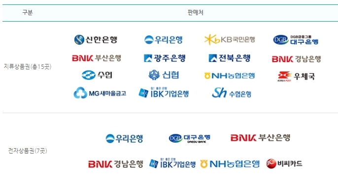 -지류(종이)상품권 판매처 : 신한은행, 우리은행, 국민은행, 대구은행, 부산은행, 광주은행, 전북은행, 경남은행, 수협, 신협, 농협은행, 우체국, 새마을금고, 기업은행, 수협은행