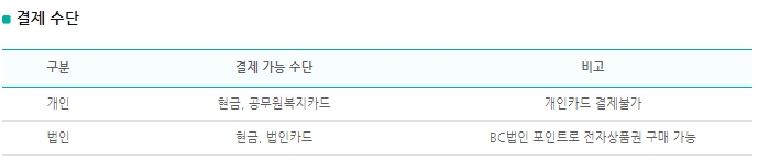 -우체국 : (법인카드) 전 카드 사용가능, (공무원 복지카드) 우체국 전용 공무원 복지카드만 가능
