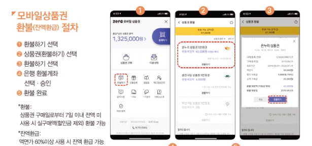 권면금액(총 구매금액)의 60% 이상 구매할 경우 잔액을 현금으로 돌려받을 수 있습니다.