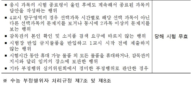 해당 선택과목 시간에는 해당 문제지만 봐야하며 해당 선택과목이 아닌 다른 선택과목의 문제지를 보거나 동시에 2개 과목 이상의 문제지를 보는 경우 부정행위로 처리된다.