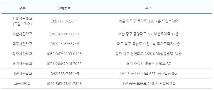 -교육은 서울, 대전, 대구, 부산, 광주, 경기(수원)지역의 공단 전용교육장(하단참조)에서 진행되며, 교육기간 동안 참석이 가능한 지역 교육장으로 신청을 하면 됩니다. 또한, 교육받는 장소와 추후 창업 지역은 무관하므로, 지역이 일치하지 않아도 됩니다.