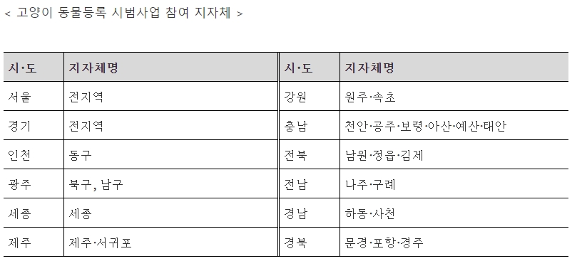 -고양이 동물등록 시범사업은 해당 지역에 거주하는 주민만 참여가 가능하며, 내장형 무선식별 장치 방식으로만 등록이 가능하다.