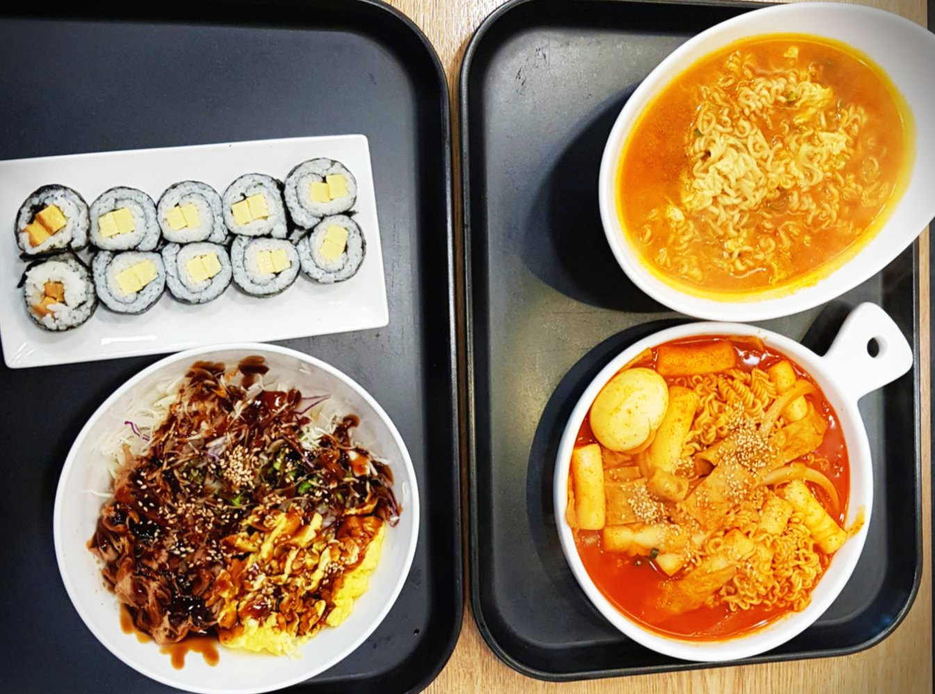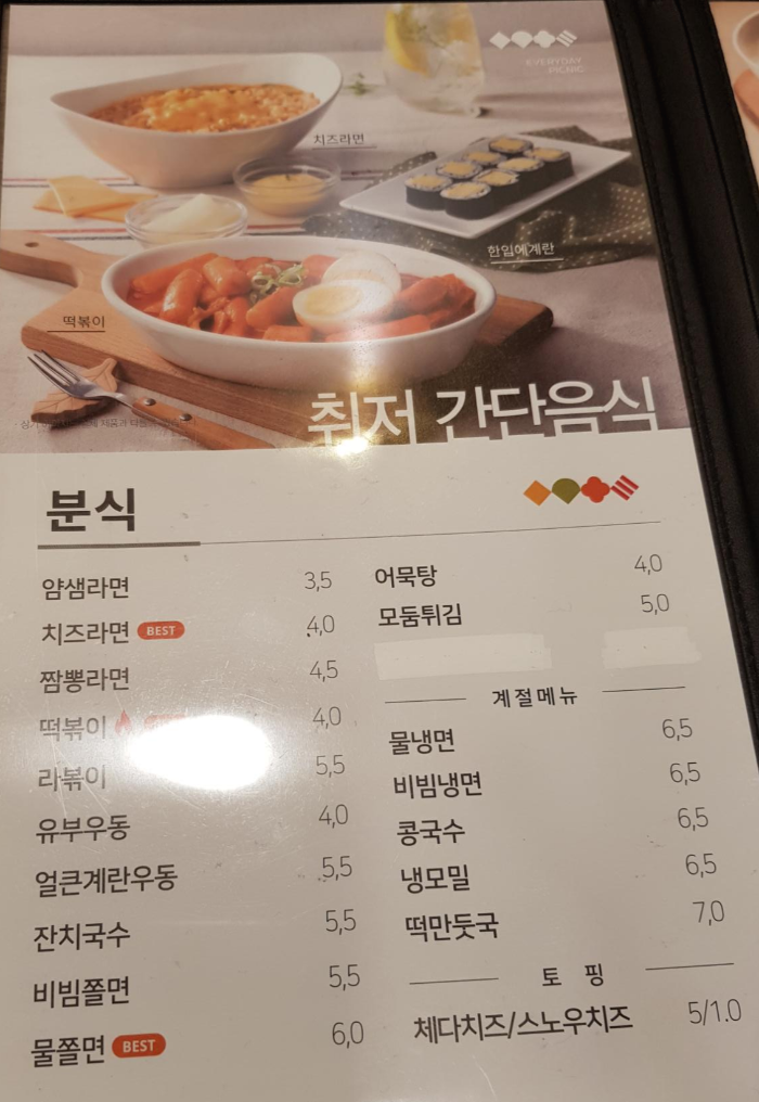 얌샘라면, 치즈라면, 짬뽕라면, 떡볶이, 라볶이, 유부우동, 얼큰계란우동, 잔치국수, 비빔쫄면, 물쫄면, 어묵탕, 모듬튀김, 물냉면, 비빔냉면, 콩국수, 냉모밀, 떡만둣국.