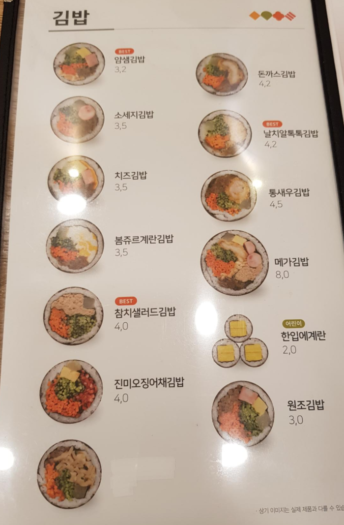 얌샘김밥, 소세지김밥, 치즈김밥, 봄쥬르계란김밥, 참치샐러드김밥, 진미오징어채김밥, 돈까스김밥, 날치알톡톡김밥, 통새우김밥, 메가김밥, 한입에계란김밥, 원조김밥.
