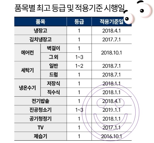정부는 이를 개선하기 위해 지난 2013년부터 제품별 에너지 소비효율 1등급 비율을 모두 10% 이하로 끌어내리려 노력했다. 효율이 좋고 나쁨을 기리기가 현실적으로 쉽지 않기 때문이다. 이를 위해 에너지소비효율등급제 기준을 강화하는 등 개선안도 마련했다. 에너지소비효율등급제는 제품별 효율에 따라 1~5등급으로 라벨을 매기는 제도이다.