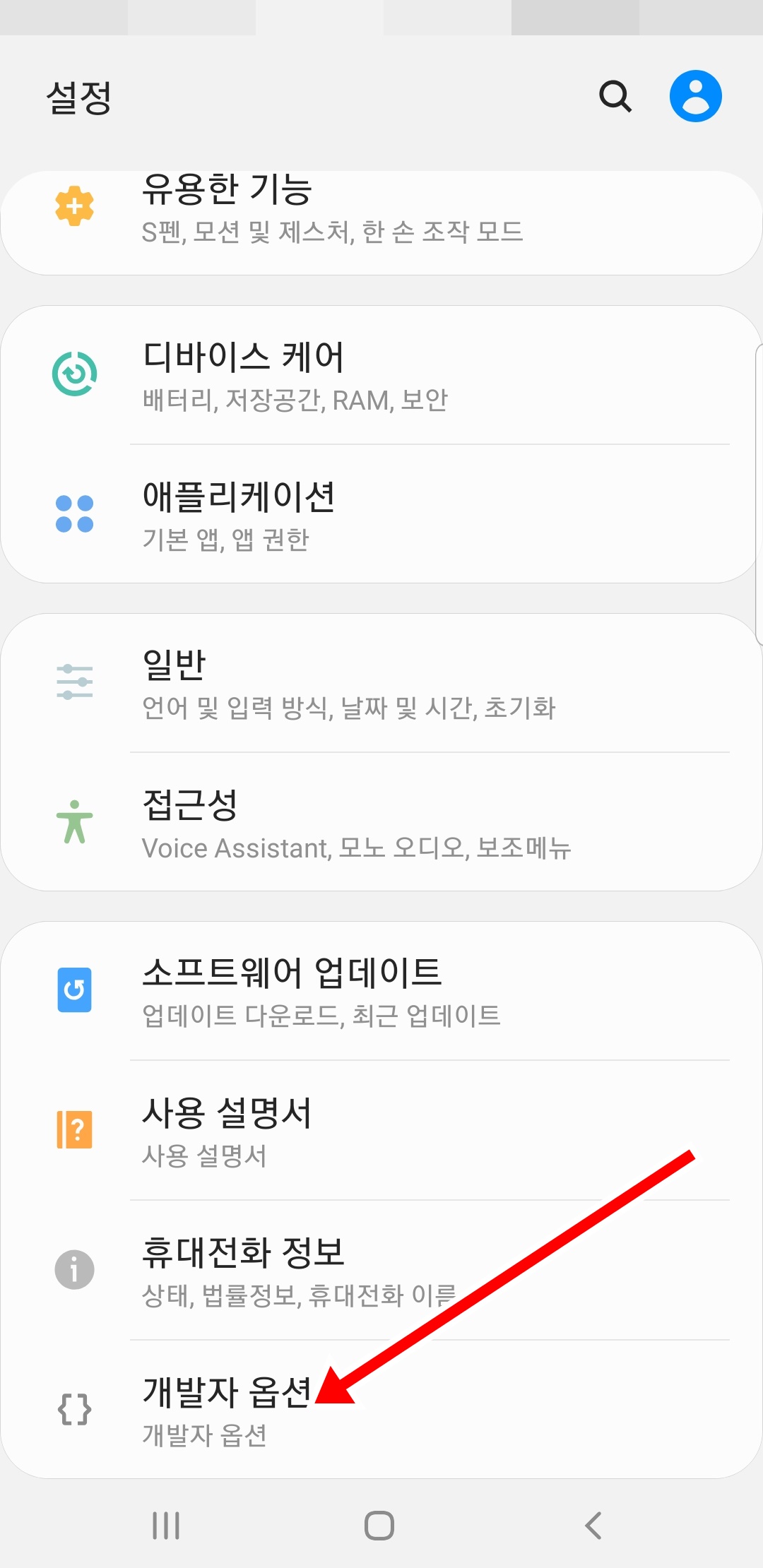 그러면 개발자 옵션이라는 부분이 새로 생긴 것을 보실 수 있을 겁니다.