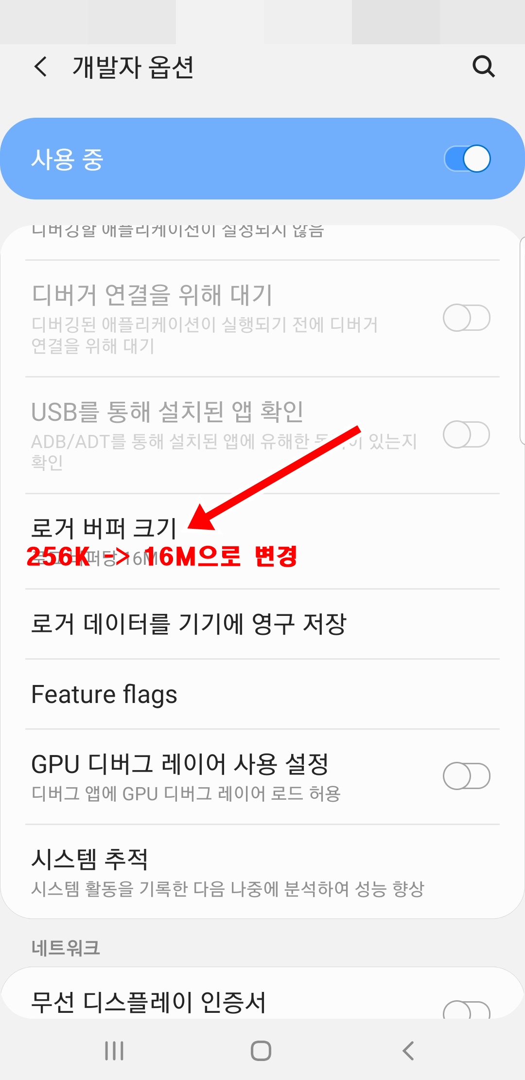 개발자 옵션 내에서 아래로 내리다 보면 로거 버퍼 크기 가 보이실 거게요. 그럼 이 부분을