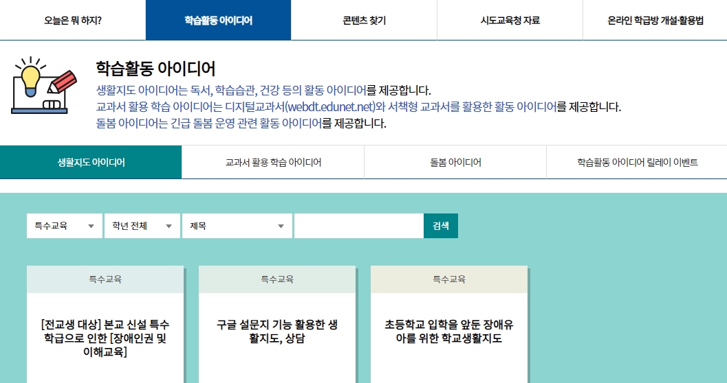 정규 교과 외에도 ‘학습활동 아이디어’ 메뉴에서는 독서, 학습 습관, 건강 관련 정보도 얻을 수 있다.