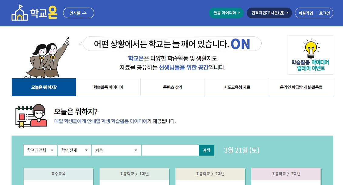 홈페이지 첫 화면은 ▲ 오늘은 뭐하지? ▲ 콘텐츠 찾기 ▲ 학습활동 아이디어 ▲ 시도교육청자료 ▲ 온라인 학급방 개설·활용법 등 5가지 메뉴로 구성되어 있습니다.