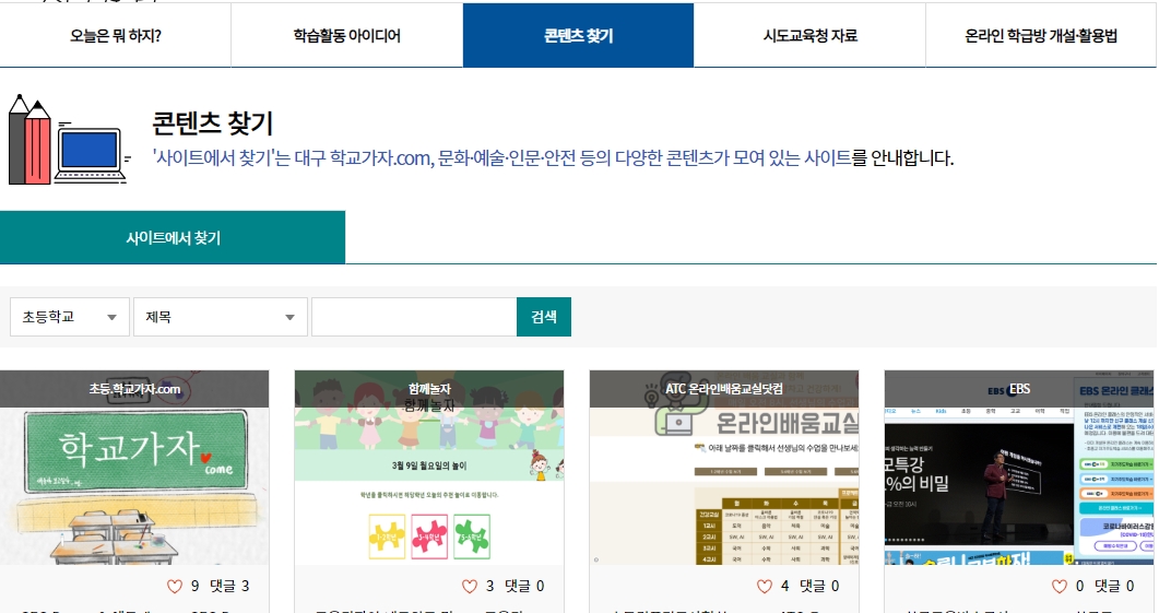 이밖에도 ‘온라인 학습방 개설·활용법’도 유익한 코너 중 하나이다. e학습터, EBS 온라인 클래스, SNS를 활용해 학급 방을 만들고 운영하는 방법을 알려준다. ‘콘텐츠 찾기’는 메뉴명 그대로 학습에 도움될만한 콘텐츠들을 검색할 수 있도록 꾸며졌다.